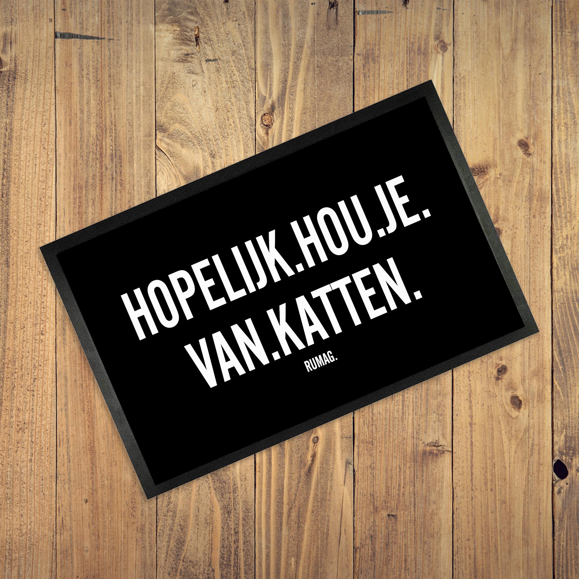 De deurmat met tekst “Hopelijk hou je van katten” is een vriendelijke waarschuwing. Hier woon jij… soort van. Je kat regeert, jij betaalt.